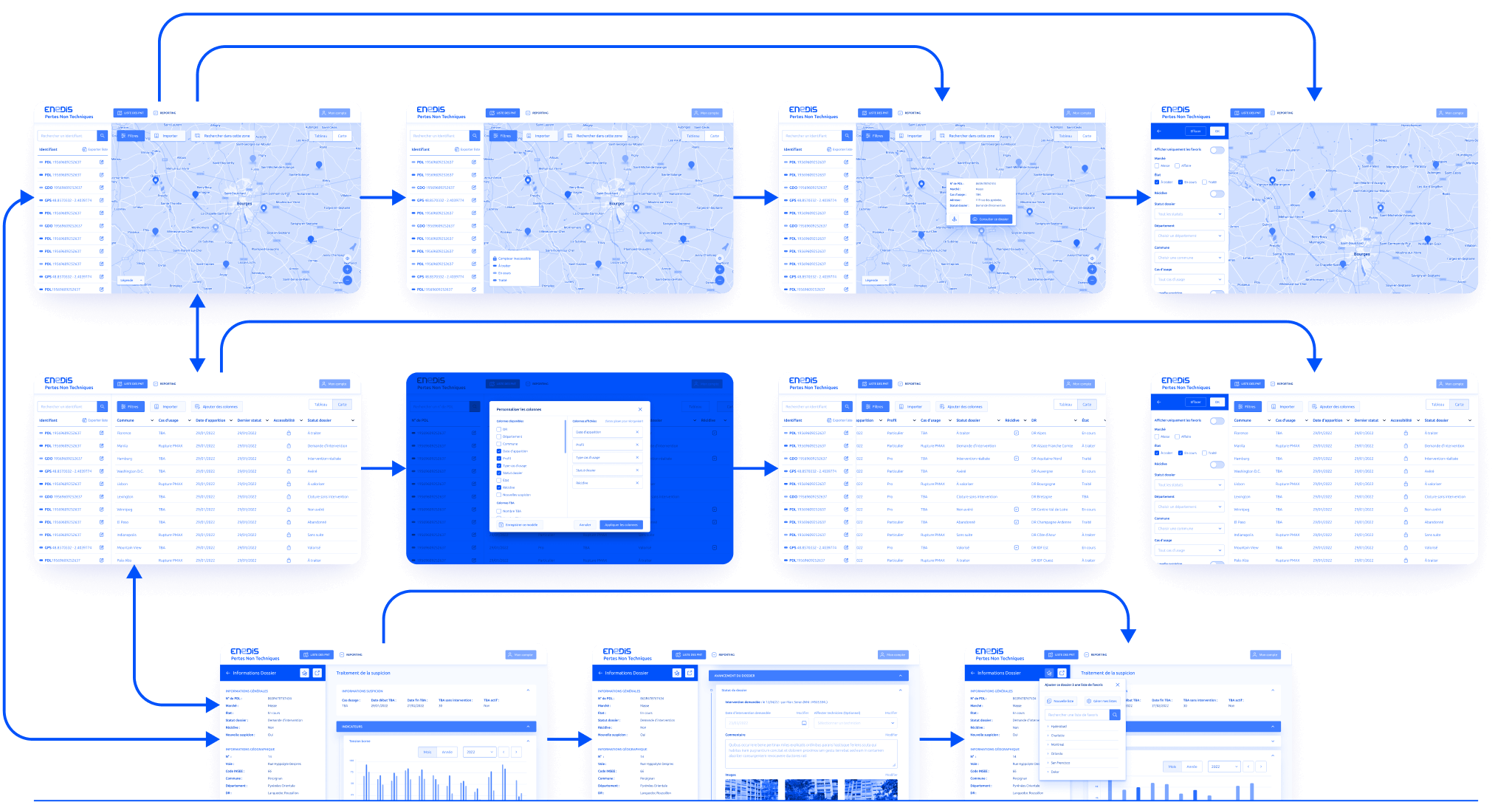 Des wireframes ont été réalisés pour matérialiser ces parcours et garantir une navigation intuitive adaptée aux besoins des gestionnaires régionaux.